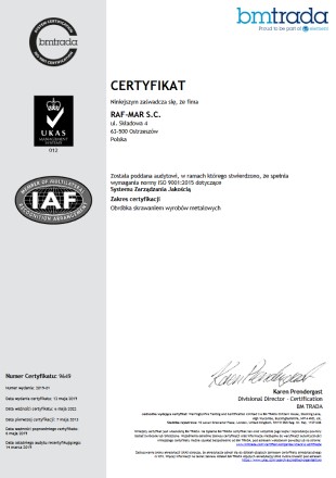 Z przyjemnością informujemy o uzyskaniu certyfikatu potwierdzającego zgodność funkcjonującego w RAFMAR S.C. Systemu Zarządzania Jakością z wymaganiami normy ISO 9001:2015. Jest on ukoronowaniem długotrwałego i pracochłonnego procesu wdrażania niniejszych wymagań oraz zaangażowania całego personelu firmy. Wraz z niniejszym certyfikatem dołączyliśmy do grupy przedsiębiorstw i instytucji, w których system zarządzania zgodny jest ze standardami międzynarodowymi. Niniejszy certyfikat potwierdza zdolność RAFMAR S.C. do realizacji usług spełniających wymagania Klientów oraz mających zastosowanie przepisów prawa. Świadczy także o tym, jak wielką wagę przykładamy do zapewnienia najwyższej satysfakcji naszych Klientów."